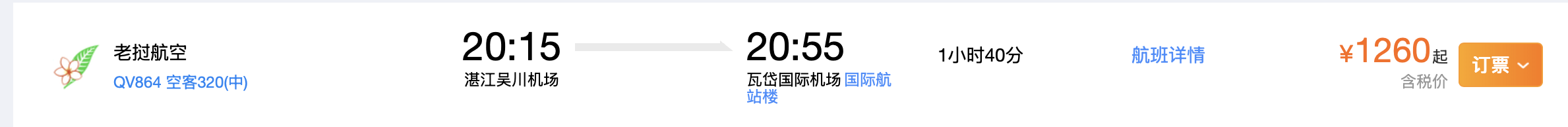 老挝航空新开通的湛江至万象航线采用空客A320机型执飞,航班号:QV863/864,班期为每周二、四、六,具体时刻为:进港航班QV863(当地时间)16:40从万象起飞,(北京时间)19:15抵达湛江;出港航班(北京时间)20:15从湛江起飞,(当地时间)20:55抵达万象,开航初期湛江直飞万象票价低至1260元(含税)。